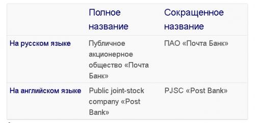 Без знаний реквизитов провести эти действия будет невозможно. Если вы часто проводите банковские транзакции с Почта Банком, то вам всегда нужно при себе иметь реквизиты. Необходимо знать правильное название банковской организации, оно может быть полным или сокращенным. Сокращенное, чаще используется в повседневной жизни. В некоторых случаях название необходимо указывать не только на русском языке, но и на международном английском.