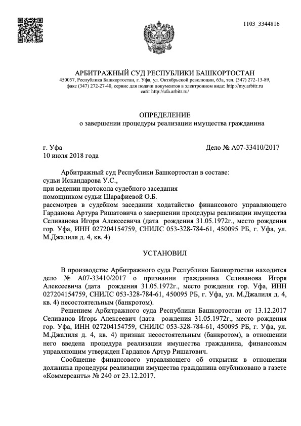 «Если у вас есть активы, стабильный доход, достаточных для оплаты кредитных обязательств, производство обычно не доводят до конфискации имущества. Арбитраж может утвердить график реструктуризации, согласно которого должник погашает свои обязательства. В случае реализации, вырученные средства будут отправлены в конкурсную массу.