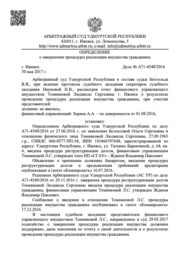 «Данному лицу (без которого не обходится ни одно банкротное дело) поручены важные задачи. Это анализ и проверка финансового положения заемщика, ведение переговоров с кредиторами, информирование арбитража и публикации. Цель финуправляющего — убедиться, что банкротство обосновано и необходимо для человека. Стоимость работы арбитражного управляющего входит в общий пакет услуг».